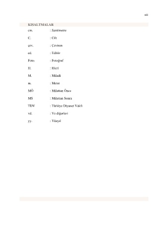 viii KISALTMALAR cm. : Santimetre C. : Cilt çev. : Çeviren ed. : Editör Foto. : Fotoğraf H. : Hicri M. : Miladi m. : Metre MÖ : Milattan Önce MS : Milattan Sonra TDV : Türkiye Diyanet Vakfı vd. : Ve diğerleri yy. : Yüzyıl