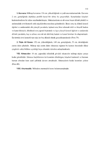 VII. Sütunceler: 10 cm. çapındaki silindirik gövdeli sütunceler mihrap nişine yarıya