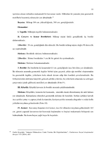 1.Bordür: 30 cm. genişliğinde düz silmedir. Bu bordür mihrap nişine doğru 90 derecelik
