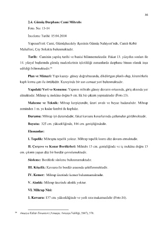almaktadır. Mihrap iç mekâna doğru 8 cm. lik bir çıkıntı yapmaktadır (Foto.13).