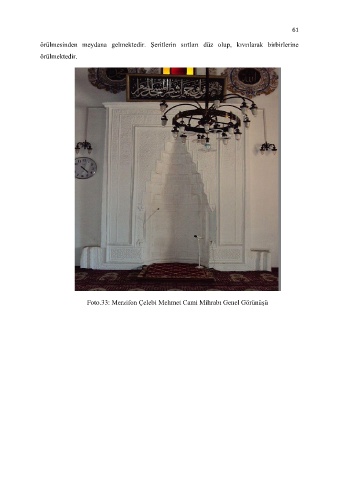 61 örülmesinden meydana gelmektedir. Şeritlerin sırtları düz olup, kıvrılarak birbirlerine örülmektedir. Foto.33: Merzifon Çelebi Mehmet Cami Mihrabı Genel Görünüşü