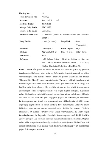 “Mehmed bin Murad” yazısı yerleştirilmiştir. Yarım ay şeklinde tasarlanmış alt